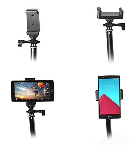100% aluminum alloy all-in-one camera pole. Compatible with GoPro Hero 4 3+ 3 2 1. Super versatile with direct GoPro mount, camera mount, phone mount, and tripod mount. Perfect for digital camera, camcorder, DSLR, iPhone 6+, Galaxy S6, LG G4, and more.