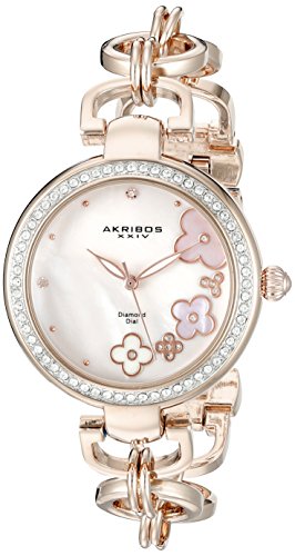 -. Binding : Watch -. Brand : Akribos XXIV -. Color : Rose/Gold -. Department : womens -. EAN : 0848572072298 -. Feature : Genuine pink mother of pearl dial with applied flowers and three hand movement / Genuine diamond hour markers with luminescent filled rose gold tone leaf style hour and minute hands / Polished rose gold tone alloy case with Swarovski crystal bezel and rose gold tone alloy bracelet / Quartz movement with analog display / Water-resistant to 30 M (100 feet) -. Label : TWI Watches, LLC -. Manufacturer : TWI Watches, LLC -. Model : AK874RG -. MPN : AK874RG -. PackageQuantity : 1 -. PartNumber : AK874RG -. ProductGroup : Watch -. ProductTypeName : WATCH -. Publisher : TWI Watches, LLC -. Studio : TWI Watches, LLC -. Title : Akribos XXIV Women's AK874RG Round Pink Mother of Pearl Dial Three Hand Quartz Rose Gold Tone Strap Watch -. UPC : 848572072298