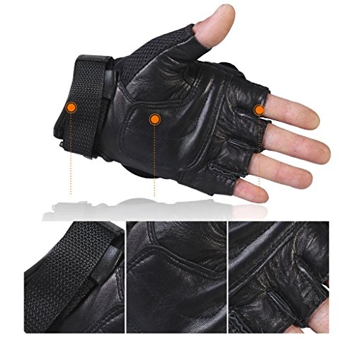 -. Feature : Made of Sheepskin leather,Plastic,Nylon,Polypropylene. / Half finger gloves will make you feel more dexterity and flexibility. It's perfect for motorcycle mountain bike riding and also benefit you to do sports fitness and hunting. / High performance cycling gloves, with hard-shell knuckles and finger protection. Breathable mesh fabric ensure finger snug and quick-drying. / Fits for other military operations. Combines strength and precision whiling shooting / Anti-slip, anti wear, anti-vibration, it keeps your riding safety, and no doubt your best choice.