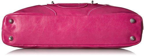 Dressy antiqued finish leatherette. Shinny nickel hardware. Full top zip closure. Exterior zip pocket. Rolled shoulder straps. Interior padded laptop divider. Organization interior wall w/ large mesh pocket.