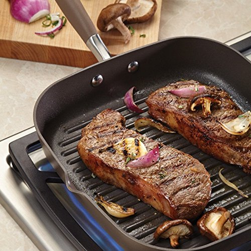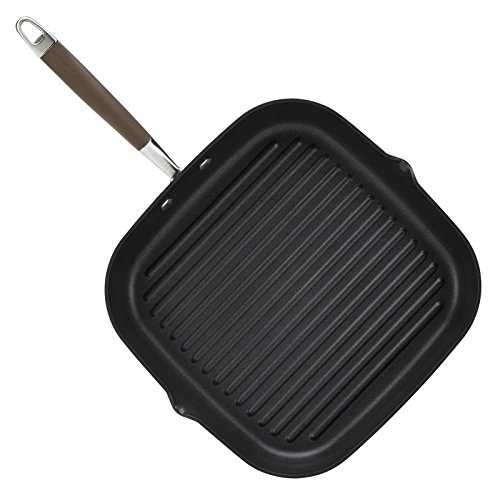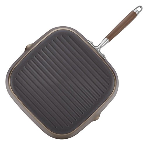 Bring delicious grilled flavors indoors with the Anolon advanced bronze hard-anodized nonstick 11-inch deep square grill pan with pour spouts. The pan features a distinctive bronze nonstick exterior and a rich chocolate-colored nonstick interior, and from base to rim, heavy-duty hard-anodized construction provides the fast, maximized heat distribution great grilling requires. Metal-Utensil-Safe, PFOA-free DuPont autograph 2 nonstick-coated ridges on the interior cooking surface help create attractive grill marks on free-range chicken breasts, sliced vegetables, and more. The channel around the pan sides collects and holds rendered fats and other unwanted liquids away from food, and the pair of corner spouts allow easy pour off when the cooking is done. Best of all, with nonstick inside and out, cleanup is effortless even with the pan's extra depth. The innovative Anolon Sure Grip rubberized handle provides a confident yet soft grasp when turning juicy bison burgers, is dual riveted for extra strength, and oven safe to 400 Degree F. And this grill pan works well with the cookware sets, stockpots, and other items in the Anolon advanced bronze collection. any Time and any season is perfect for delicious grilling with the Anolon advanced bronze hard-anodized nonstick 11-inch deep square grill pan with pour spouts.Feature