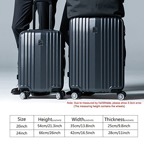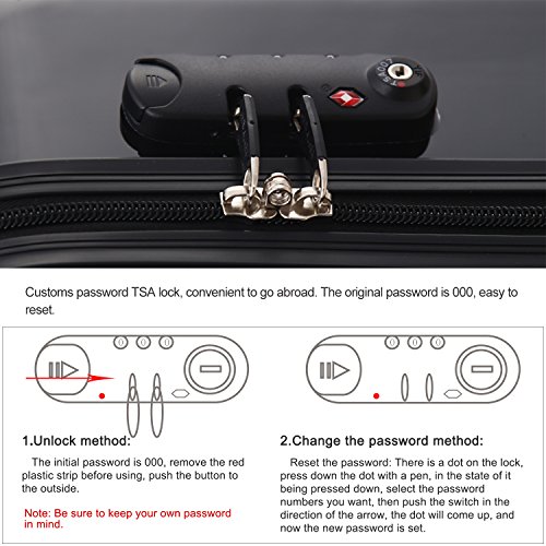 -. Feature : Ultra light-weight construction,sturdy ergonomic aluminum telescoping handle. Can be expanded to increase capacity. / 4-Wheel Spinners allow for full 360 degree mobility,for smooth-rolling mobility in any direction. / PC material,durable and lighter hard shell,features textured finish to prevent against scratches,ensures long-lasting usage and safety. / Squared full-capacity design,fully-lined interior with handy divider and zippered pocket for easy organizing. / Side mounted TSA lock,TSA lock which allows only TSA agents to inspect your bags without damaging the lock.