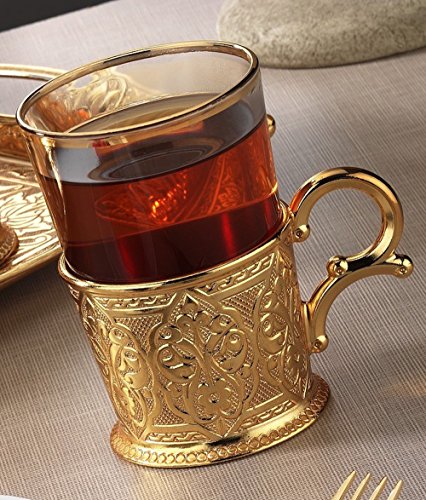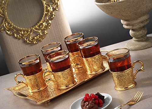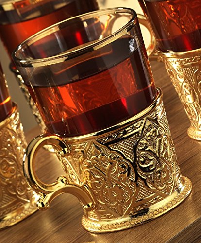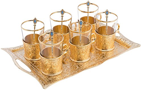 (CopperBull)/Kitchen Dining/Tableware/DIRECT FROM USA/Turkish Tea Set for 6 - Decorated Glasses with Brass Holders Tray Spoons, Gold (6.6 Oz (200ml))