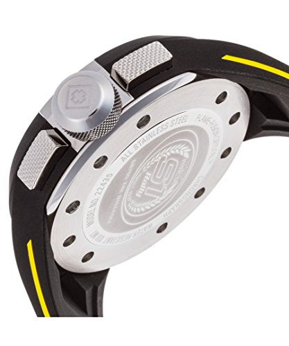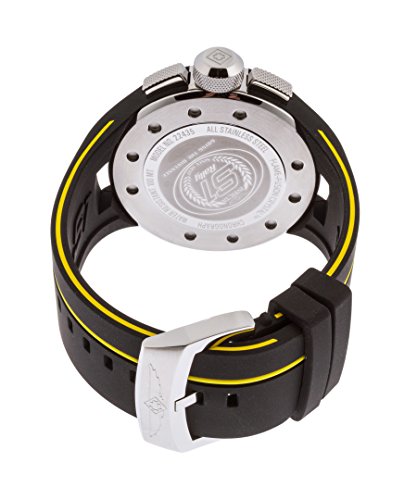 -. Feature : Chronograph functions with 60 second, 60 minute and 1/10 of a second silver sub dials; date window at 3:00; stainless steel accents on bezel / Black dial with black, yellow and white hands and white and black hour markers; luminous; flame fusion crystal; stainless steel case with black silicone cover; black silicone strap with yellow stripe / Quartz Movement / Case Diameter: 52mm / Water resistant to 100m (330ft): in general, suitable for swimming and snorkeling, but not diving