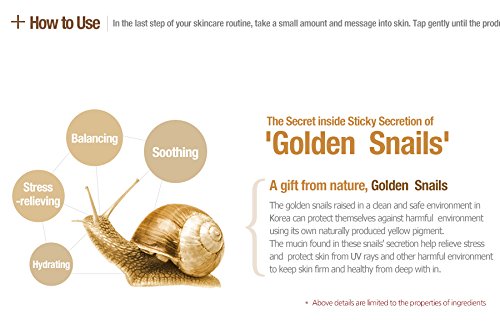 -. Feature : Formulated with 60% Golden Snail Mucin, known to promote elasticity and improve resilience in skin / Nutrient rich formula restores skin health and provides lasting hydration / Colloidal Gold promotes skin's electrical balance, while removing toxins and stabilizing skin's overall health