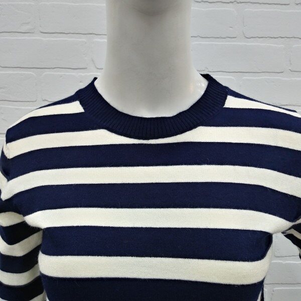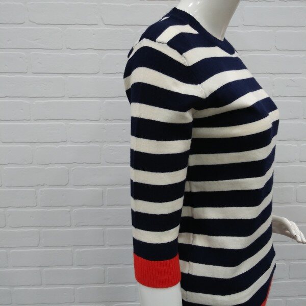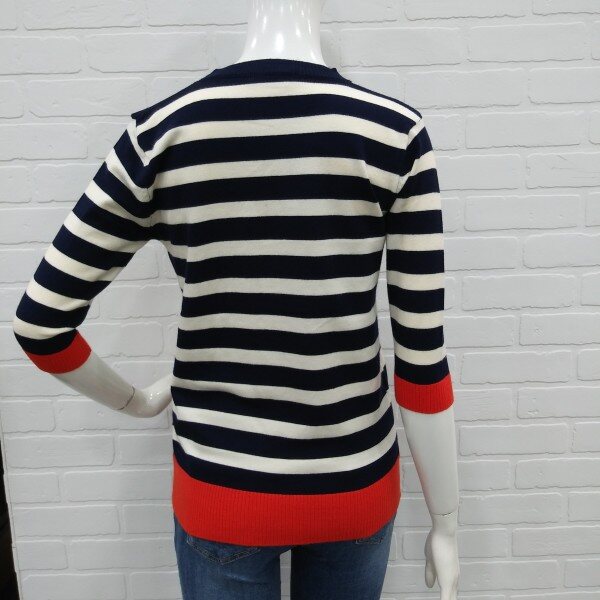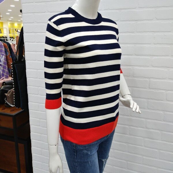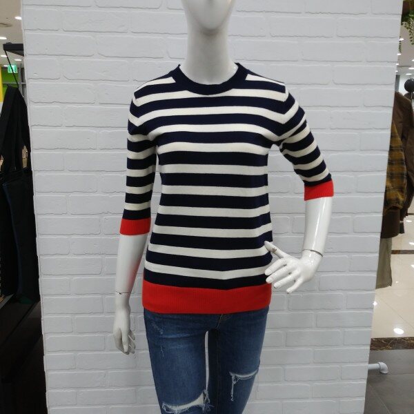 배색단가라 니트티로 신축성있어 편하고 7부소매라인과 배색이 들어가있어 포인트하게 입기좋은 니트티 이에요