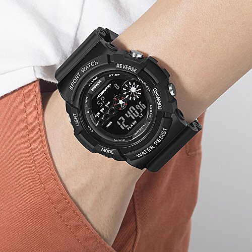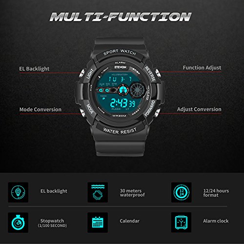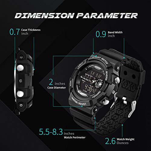 MULIT-FUNCTION OF WATCH: 12/24-hour format, EL backlight, calendar(date, week and month), hourly chime, alarm with snooze, stopwatch and split time etc.