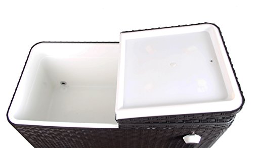 Uniquely designed dual top is easy for full access to contents.Convenient bottle opener and bottle cap catch bin attached to the side. Drain plug on back for easily draining and cleaning.Bottom shelf provides additional storage space.