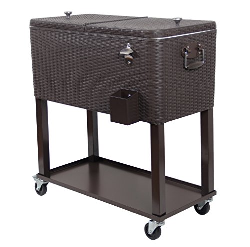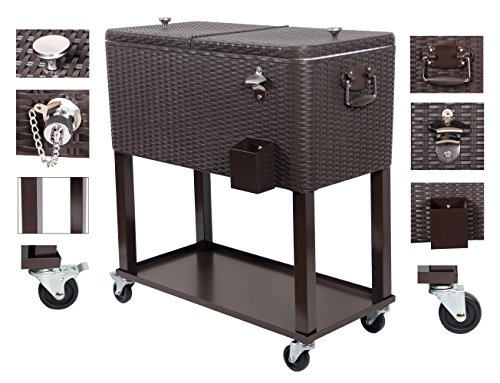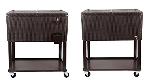 UPHA 80 Quart Rolling Ice Chest Portable Party Bar Drink Entertaining Outdoor Patio Cooler Cart on Wheels with Shelf,Brown Wicker Pattern