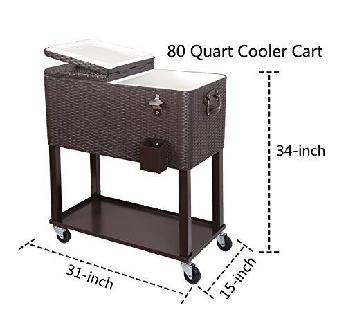 Dimensions: 31"L x 15"W x 34"H. Oversized 80 Quart rolling patio cooler cart, holds up to 100 cans / 50+ bottles and keeps cool for days. Simple assembly required but all necessary hardware is included.