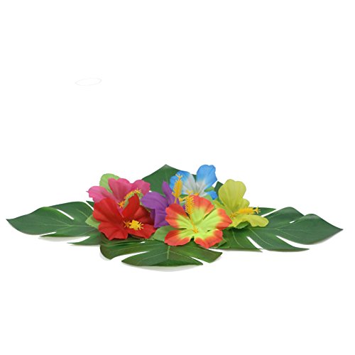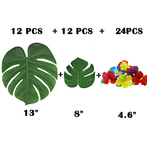 - Material:Silk;Quantity:24pack of Hibiscus flowers,12pack of 13.8" Palm leaves,12pack of 8" Palm leaves