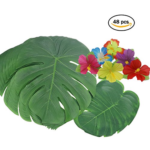 Tropical Leaves and Hibiscus Flowers,Artificial Fake Green Palm Leaves Plants for Hawaiian Luau Patry Decorations,48pack Total