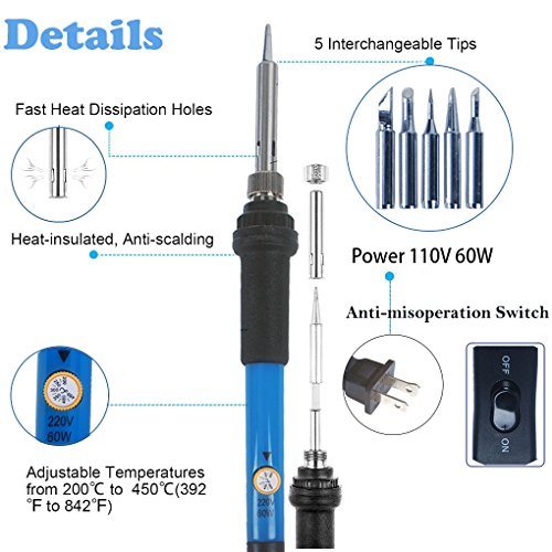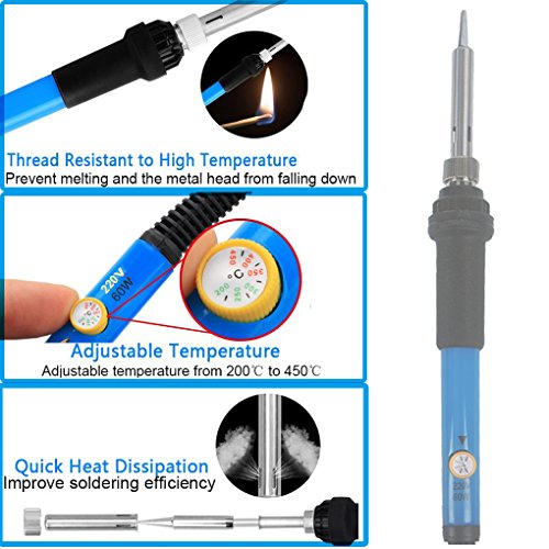 - Adjustable Temperature:The 60W soldering iron heats up very fast with inner-heated ceramic technology.Adjustable Temperature from 200℃-450℃.Heat up fast and work great.