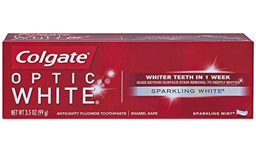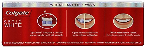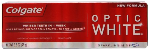 -. Binding : Health and Beauty -. Brand : Colgate -. EAN : 0035023007637 -. Feature : Whitens teeth in 1 week; Provides daily ant cavity fluoride protection / Goes beyond surface stain removal to deeply whiten with peroxide, unlike ordinary toothpaste / Available in a sparkling mint flavor, helping to freshen breath while whitening as you brush every day / Is enamel safe and intended for twice daily use -. Label : COLGATE - PALMOLIVE COMPANY -. Manufacturer : COLGATE - PALMOLIVE COMPANY -. PackageQuantity : 3 -. ProductGroup : Beauty -. ProductTypeName : HEALTH_PERSONAL_CARE -. Publisher : COLGATE - PALMOLIVE COMPANY -. Size : 3.5 Ounces -. Studio : COLGATE - PALMOLIVE COMPANY -. Title : Colgate Optic White Sparkling Mint Toothpaste 3.5oz (Pack of 3) -. UPC : 035023007637