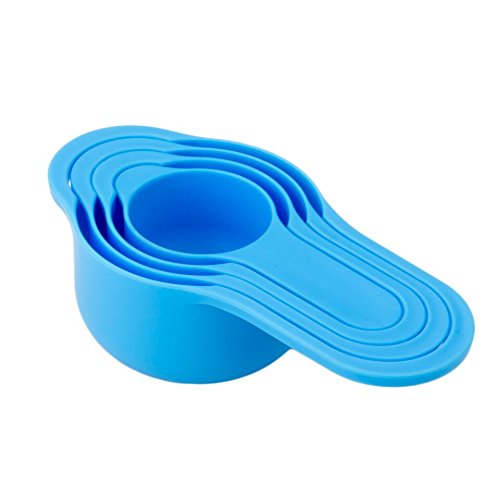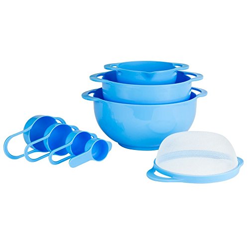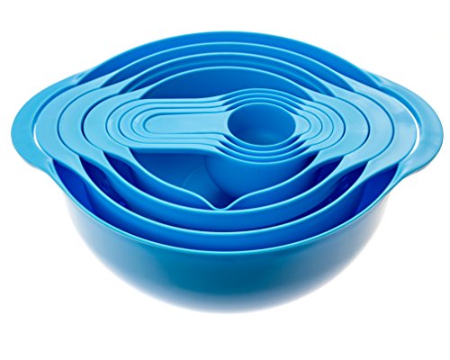 Set of 8 Compact Nesting Mixing Bowl Set Measuring Tools Sieve Colander Food Prep Plastic Dishwasher Safe Non-Slip, 8-Piece, By Intriom (Blue)