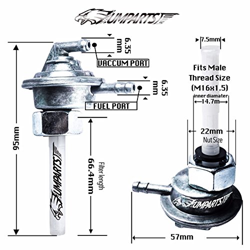 -. Brand : Scooters -. EAN : 7597934584094 -. Feature : Fits 49cc 50cc 125cc 150cc - Gy6 Scooter Mopeds / This is the Non original aftermarket part / Fuel Pump Valve Petcock w/ filter Scooter Moped Motorcycle 50cc 125cc 150cc GY6 - 0801 / Screw Inner Diameter (Nut): 14.7 mm Screw Outer Diameter (Nut): 22 mm Filter Length: 59 mm Thread Size: 16 mm x 1.50 M fuel line port outer diameter: 6 mm / Please measure the nipple on the bottom of your tank if it is 16mm (.62" 5/8") (Male tank). This Fuel Petcock will only fits 16mm (.62" 5/8") (Male tank) . It won't fit M14 (.55", just under 9/16") (Male Tank). -. IsAutographed : 0 -. IsMemorabilia : 0 -. Label : Scooters -. Manufacturer : Scooters -. MPN : Scooters -. PartNumber : Scooters -. ProductGroup : Sports -. ProductTypeName : OUTDOOR_RECREATION_PRODUCT -. Publisher : Scooters -. Studio : Scooters -. Title : Gas Petcock Fuel Pump Valve 49cc 50cc 125cc 150cc Gy6 Chinese Scooter Moped 16mm