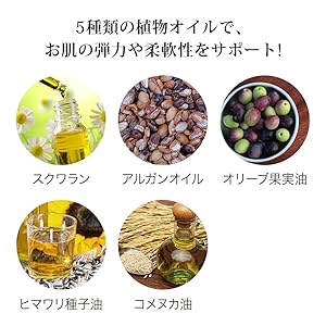 保湿力が高くお肌の柔軟性を高める性質があるスクワランや、いきいきとした柔らかいお肌に導くアルガンオイルを含む、こだわりの5種類の植物オイルを配合しました。