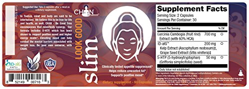 -. Feature : Look Good SlimTM takes full advantage of Garcinia Cambogia by using 700mg per serving in its recipe. Garcinia Cambogia has been used for its many potential positive properties related to weight issues. Garcinia Cambogia may help suppress appetite, reduce cravings, improve mood, and in some cases may even help block fat.* / ID-alGTM is a combination of Kelp and Grape Seed extracts. Kelp extract may help increase the thyroids efficiency while grape extract contains antioxidant polyphenols which may help in the body's ability to break down fat.* / 5-HTP (from Griffonia simplicifolia) is essential in the brains production of serotonin. With 50mg per serving in Look Good SlimTM it may lead to a reduction in cravings, elevated mood, and better sleep.* / Look Good SlimTM is an appetite suppressant and fat burner. It is also good for those who are looking to increase their metabolism. / For best results, use as directed on bottle. Always seek a professional opinion before starting any dietary supplement. This 60 Capsule, 30-day Supply dietary supplement is made in California, USA.