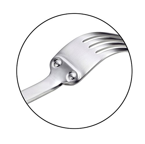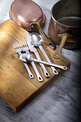 The pierced handle, fashioned after traditional copper cookware, is both functional and decorative with faux rivets on the back of the working ends. Brushed finish. • Dishwasher safe, never needs polishing