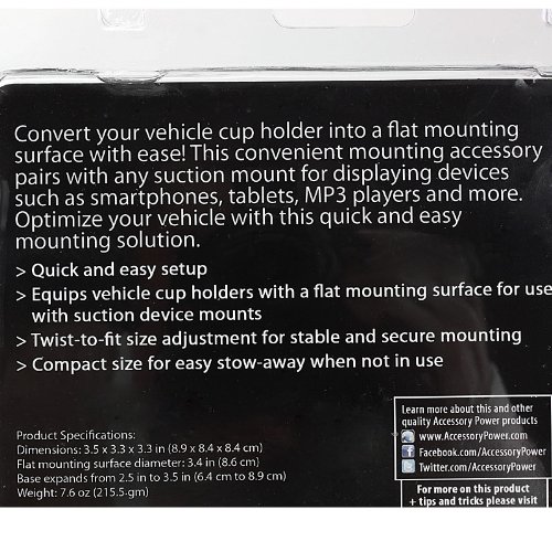 Universal Vehicle Cup Holder Adapter w/ Suction Mount Surface VERSATILE This Universal Mounting Surface Cup Holder Adapter provides an ideal flat mounting space for almost ALL OEM windshield suction device mounts. The Cup Mount is perfect for GPS, Smartphone, Tablet, Laser / Radar Detector, MP3 player, and other types of device mounts! SAFE & DISCREET Provide an extra level of safety and security for your vehicle. A closer, more discreet mounting surface means no more squinting and less worrying about people tampering with your car. Having a mount-free windshield provides both discretion and safety. Keeping your mount out of your direct line of vision ensures a clearer view of the road and an overall safer drive. EASY INSTALLATION Twist-to-Fit design utilizes an expanding weighted base to securely mount your device holder with ease. The universal base adjusts to fit most cup holders from 2.5"-3.75" wide. With no sticky pads or screws, transporting your mounts and devices between cars is incredibly easy! Works With: GPS: Garmin nuvi 52LM , 2555LMT , 40LM , 2597LMT , 50LM , 2557LMT , 2595LMT / TomTom START 55TM , VIA 1535TM / Rand McNally TND 720 LM / Magellan RoadMate 5045-LM Smartphones: Apple iPhone 6 , Samsung Galaxy S5 , LG G3 , HTC One M8 , OnePlus One , Nokia Lumia 635 , Xiaomi Mi4 , Sony Xperia Z3 Tablets: Acer Iconia One 7 , Apple iPad 4 , Dell Venue 8 Pro , Microsoft Surface Pro 3 , Samsung Galaxy Tab 4 , Sony Xperia Z3 , NVIDIA Shield Tablet Radar Detectors: Cobra XRS9370 , ESD7570 , XRS 9745 / Escort Passopot 9500ix , Max , 8500X50 / Whistler Cr90 MP3 Players: Apple iPod , Kubik Evo , SanDisk Sansa Clip Zip , Samsung Galaxy Player , Sony Walkman , Philips GoGear , Microsoft Zune HD , PONO , Beats Music