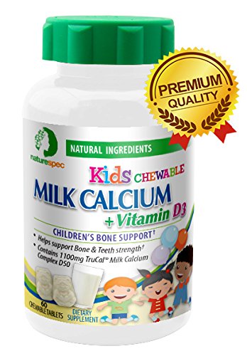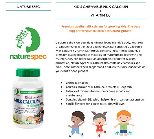 Studio : Nature Spec Publisher : Nature Spec Binding : Health and Beauty Product Description Nature Spec Kid's Chewable Milk Calcium Calcium is the most abundant mineral found in a child's body, with 99% calcium being found in their teeth and bones. Nature SpecTM Kid's Chewable Milk Calcium Vitamin D3 formula contains high quality TruCal®milk calcium, it has the correct balance of minerals required for maximum bone growth and maintenance. For better calcium absorption, Nature SpecTM combines Vitamin D3 and Zinc. These nutrients help support and establish the very foundation of your child's structural growth! Calcium benefits for children . Essential for normal bone and tooth development . The cardiovascular and nervous system both use calcium . Vital for blood clotting . Keeps bones strong . Calcium is required for the body to function normally and to think. Nature SpecTM Kid's Chewable Milk Calcium Advantages . Chewable tablets . Vanilla Flavored with a great taste kids will love . Contains TruCal® Milk Calcium . TruCal® Milk Calcium contains the correct balance of minerals required for maximum bone growth and maintenance . Contains Vitamin D3, which helps with calcium absorption 0