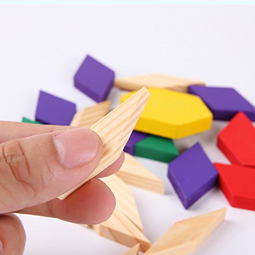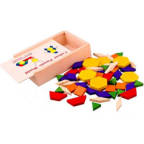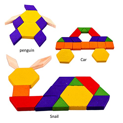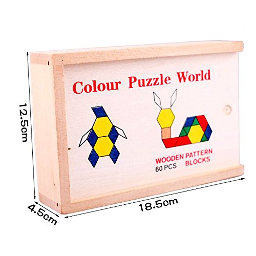 -. Feature : Wooden Pattern Blocks are standardized in shape and color to provide consistency in learning, can creat different pattern and animals, practice imagination / These blocks help build a strong math foundation by starting with the basics of learning of shapes and colors recognition, counting and following pattern sequences / Children can create designs to explore spatial relations, symmetry, and attributes that can provide a context for developing language related to math and geometry / Great Montessori learning tool, Wooden box will let you store or carry it more convenient / 60 piece jigsaw puzzle blocks for kids, For age 3 years-12 years