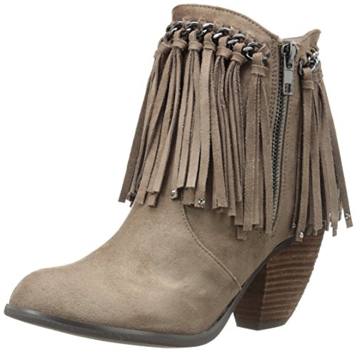 Stacked-heel boot featuring fringe and metallic hardware at shaft