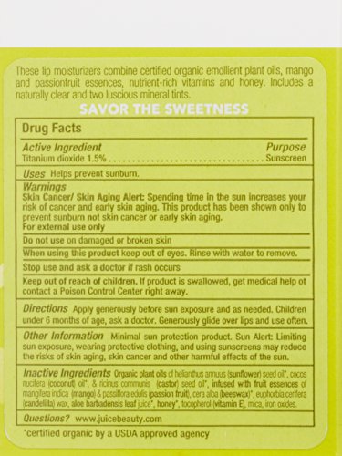 -. Binding : Health and Beauty -. Brand : Juice Beauty -. Department : 22 Oral Care -. EAN : 0834893000102 -. Feature : Protects and moisturizes for sweet, kissable lips. -. Label : Juice Beauty -. LegalDisclaimer : This product can only be shipped to the following countries: United States, Canada -. Manufacturer : Juice Beauty -. Model : 477910 -. MPN : AAJ-037 -. NumberOfItems : 1 -. PackageQuantity : 1 -. PartNumber : AAJ-037 -. ProductGroup : Prestige Beauty -. ProductTypeName : LUXURY_BEAUTY -. Publisher : Juice Beauty -. ReleaseDate : 2011-05-25 -. Size : .15 oz each -. Studio : Juice Beauty -. Title : Juice Beauty SPF 8 Lip Moisturizers -. UPC : 834893000102