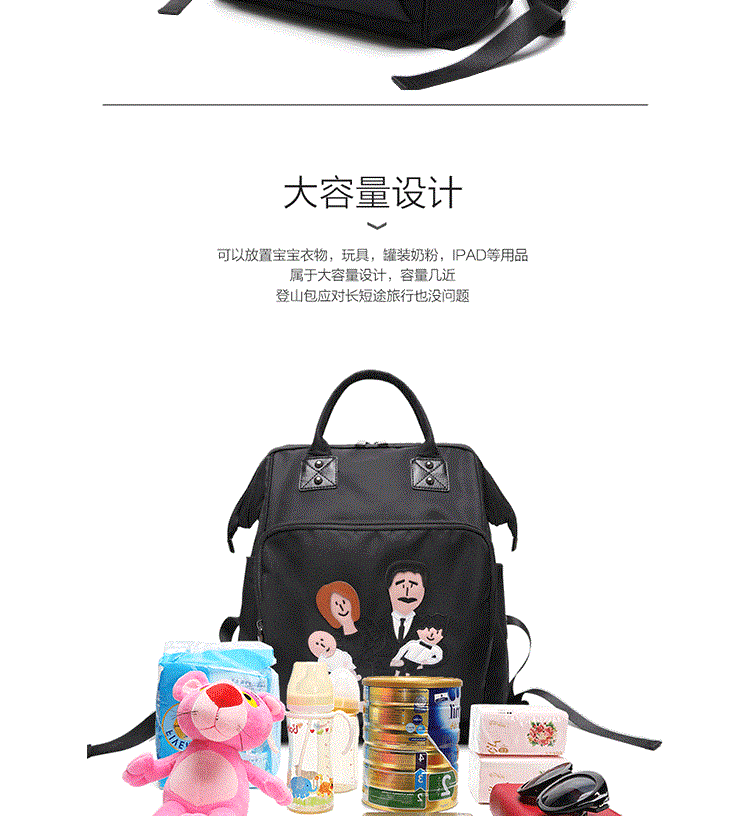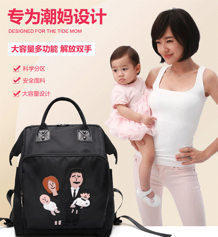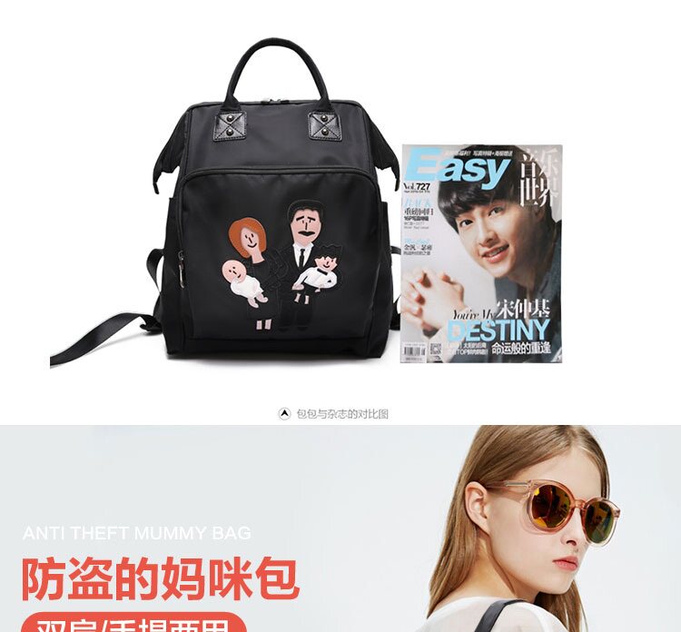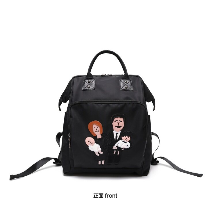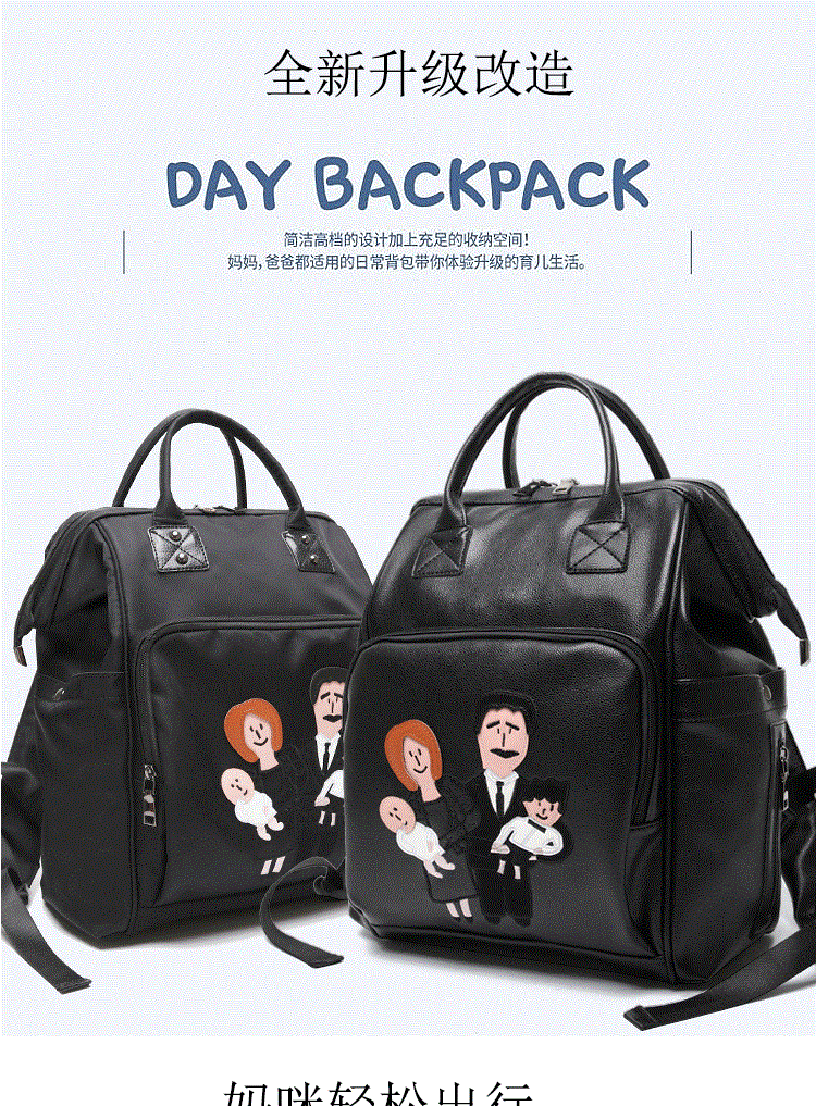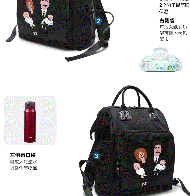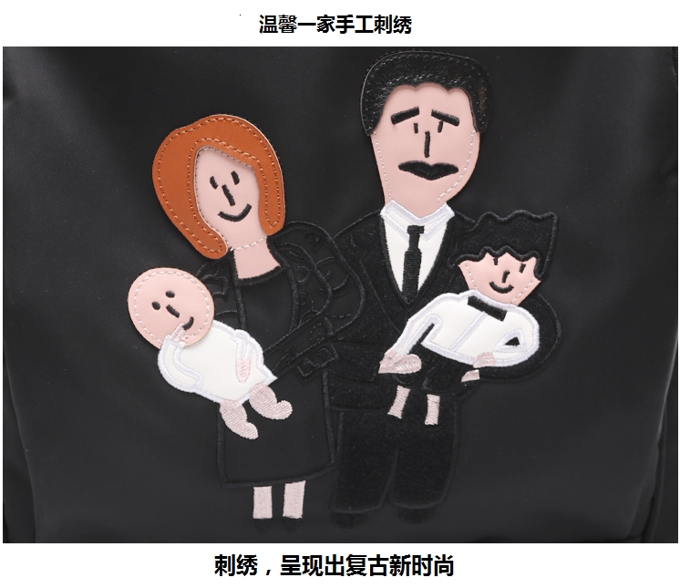 温馨一家四口刺绣 前面两个保温奶瓶位置 主口袋两边带有干湿分离 可双肩背 单肩背 手提