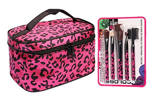 Pink Leopard Print Soft Cosmetic Case Travel Bag w/ Matching Brushes