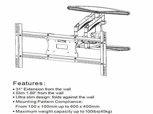 -. Feature : 31" Extension to view and rotate screen up to 75 degrees in each direction / 1.69" Slim Profile lets you push back the TV to almost Flat position / 100 Lbs load Capacity, with Swivel, Tilt, Pan and Roll option / 200x200 to 600x400 VESA support (600x400, 400x400, 400x300, 300x200, 200x200) / Dual Arm, Dual Stud very strong