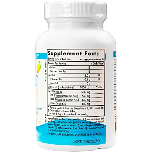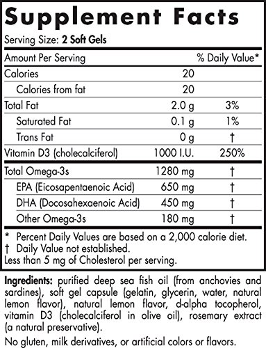 The #1-selling omega-3 in the U.S., with added vitamin D3. Each serving of this formula includes concentrated omega-3s EPA and DHA, plus 1000 I.U. of vitamin D3, meeting the daily recommendation for children and adults who do not receive adequate sun exposure. Long known for its key role in building strong bones, vitamin D3 is linked to other roles in optimizing health including the regulation of the immune system, mood, and sleep rhythms.