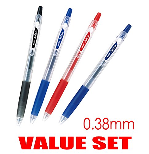 Pilot Juice Retractable Premium Gel Ink Roller Ball Pens, Ultra Fine Point 0.38mm, Black, Blue, Red and Blue Black Ink, Each 1 Pen- value Set of 4