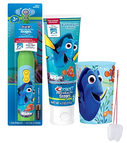 -. Binding : Health and Beauty -. Brand : Disney -. EAN : 0761656264641 -. Feature : Make brushing magical with your friends Dory & Nemo! / (1) Turbo Powered Finding Dory Spin Toothbrush! Batteries Included / (1) Finding Dory Toothpaste - A Disney Bubblegum Flavor Gel Formula, 4.2 oz / (1) Finding Dory 16 oz Plastic Mouthwash Rinse Cup / Plus Bonus "Remember to Brush" Visual Aid Tooth Saver. Hang it in their bathroom or by their bed so they remember to keep their chompers sparkly fresh. You could also use these tooth charms to save one of your child's baby teeth. -. IsAdultProduct : 0 -. Label : Crest -. Manufacturer : Crest -. MPN : 049-09-1063 -. PackageQuantity : 3 -. PartNumber : 049-09-1063 -. ProductGroup : Health and Beauty -. ProductTypeName : HEALTH_PERSONAL_CARE -. Publisher : Crest -. Studio : Crest -. Title : Disney's "Finding Dory" 3pc. Bright Smile Oral Hygiene Set! Includes Dory Turbo Powered Toothbrush, Toothpaste & Nemo Mouthwash Rise Cup! Plus Bonus "Remember to Brush" Visual Aid! -. UPC : 761656264641
