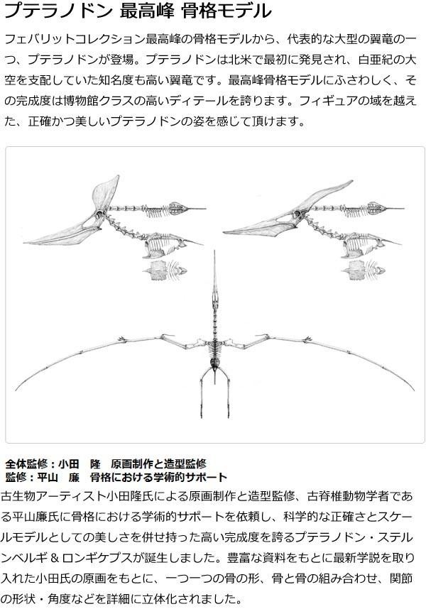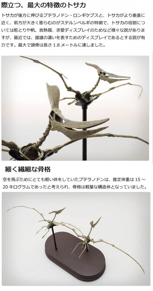 代表的な大型の翼竜の一つ、プテラノドンが登場です。プテラノドンは北米で最初に発見され、白亜紀の大空を支配していた知名度も高い翼竜です。最高峰骨格モデルにふさわしく、その完成度は博物館クラスの高いディテールを誇ります。フィギュアの域を越えた、正確かつ美しいプテラノドンの姿を感じて頂けます。 |