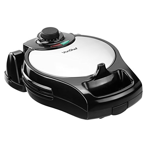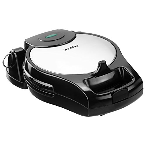 -. Brand : VonShef -. Color : Silver/Black -. EAN : 5060351496247 -. Feature : Rotating design with thick 8 inch baking grid in four easy-to-cut sections. / Simple 180° flip operation for evenly cooked, golden brown waffles. / Non-stick interior offers easy waffle release and no-fuss cleaning. / Heavy duty brushed stainless steel / black exterior with power on and ready indicator lights and locking handle for convenient storage. / A perfect gift to give this Christmas. -. Label : Designer Habitat Ltd -. Manufacturer : Designer Habitat Ltd -. ProductGroup : Kitchen -. ProductTypeName : KITCHEN -. Publisher : Designer Habitat Ltd -. Studio : Designer Habitat Ltd -. Title : VonShef Flip 4 Slice Rotating Round Belgian Waffle Maker Stainless Steel
