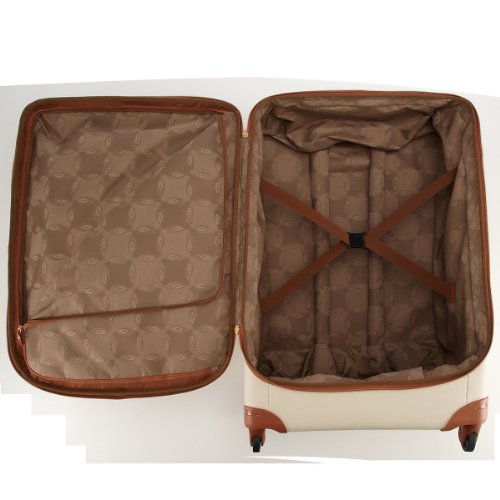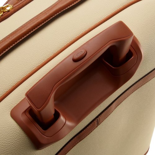 -. Feature : Embossed leather-like PVC with vegetable tanned leather trim / Four 360 degree spinner wheels / Telescopic, dual tube, push-button handle system / Top and side carry handles / Front zipper accessory pocket