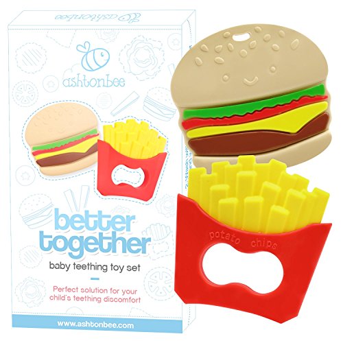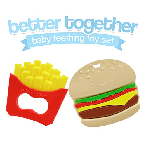 PERFECT GENDER-NEUTRAL GIFT IDEA -- This Better Together Burger & Fries Teething Set is a fun, quirky gift to parents and parents-to-be that are sure to bring smiles to their faces, and their little one too