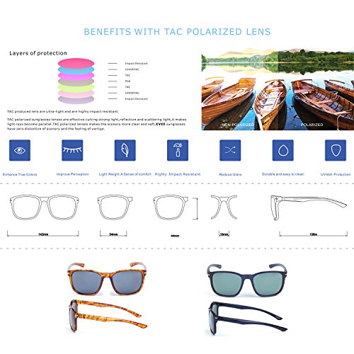 Comfort Fit - Our injection plastic frame is both flexible and lightweight, with a comfortable fit for everyday wear TAC Polarized Lens – Offer Top UV Protection filtering 100% of all UVA/UVB and Harmful Blue Light Up to 400nm.