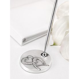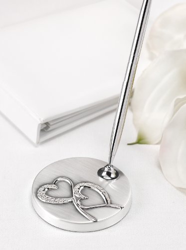 Sparkling love brushed silver base with double-heart design and rhinestone accents holds a silver-tone pen that writes in black ink. Base is 3-Inch diameter. This beautiful pen is sure to inspire your guests to write well wishes you'll treasure for a life time. Your wedding deserves the best - and the best comes from Hortense B. Hewitt, the leader in quality wedding accessories for more than 60 years.