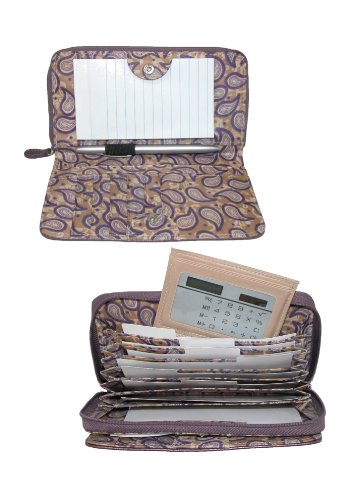 Main interior includes 8 gusseted coupon or receipt slots, an ID holder, and removable calculator. Side wallet compartment includes 6 card slots, 2 full length slip pockets, pen in pen holder, and a lined note pad