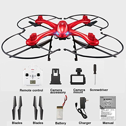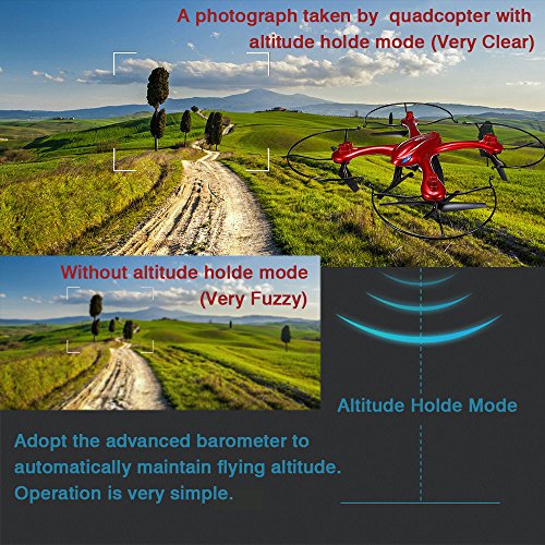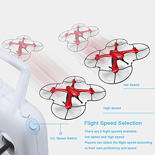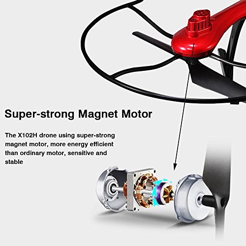 -. Feature : Unique Eagle Shape with Colorful Flashing Lights - This eagle shape quadcopter makes it look very cool and attractive, he's body is red, very bright, easy to spot and see it when flying. The quadcopter has night navigation lights too,you can enjoy this quadcopter both during the day and at night / Super Strong Magnet Motor - Our X102H quadcopter using super-strong magnet motor,useing high efficiency of energy conversion devices,more energy efficient than ordinary motor,sensitive and stable,to provide a strong driving force for the quadcopter / 2 Flight Speed Can be Selected - There are 2 flight speeds available:low speed and high speed. Players can select the flight speed according to their own proficiency and space / Fly up to 11 Minutes - Our quadcopter is equipped with a 7.4v 1200mAh large capacity lipo battery,full charged battery can support 11 minutes steady flight,you can enjoy a longer flight time / Altitude Holde Mode - X102H quadcopter adopt the advanced barometer to automatically maintain flying altitude. Operation is very simple,so that you can enjoy the easier flight,taking clear photo and video
