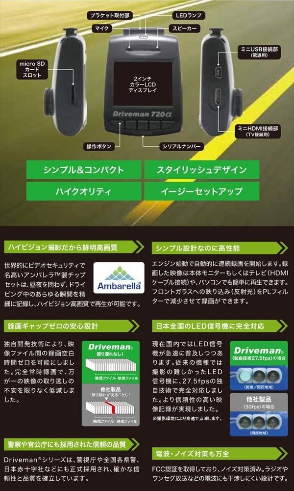 無駄な機能を省いた小型の常時録画式ドライブレコーダー。アンバレラ製チップセットが、ハイビジョン高精細録画を実現しドライビング体験を鮮明に記録します。音声と映像が確認できるので旅先でドライブ中の風景を楽しむことができ、予期せぬ事故など万が一のトラブル発生時にも、心強い味方になります。 |