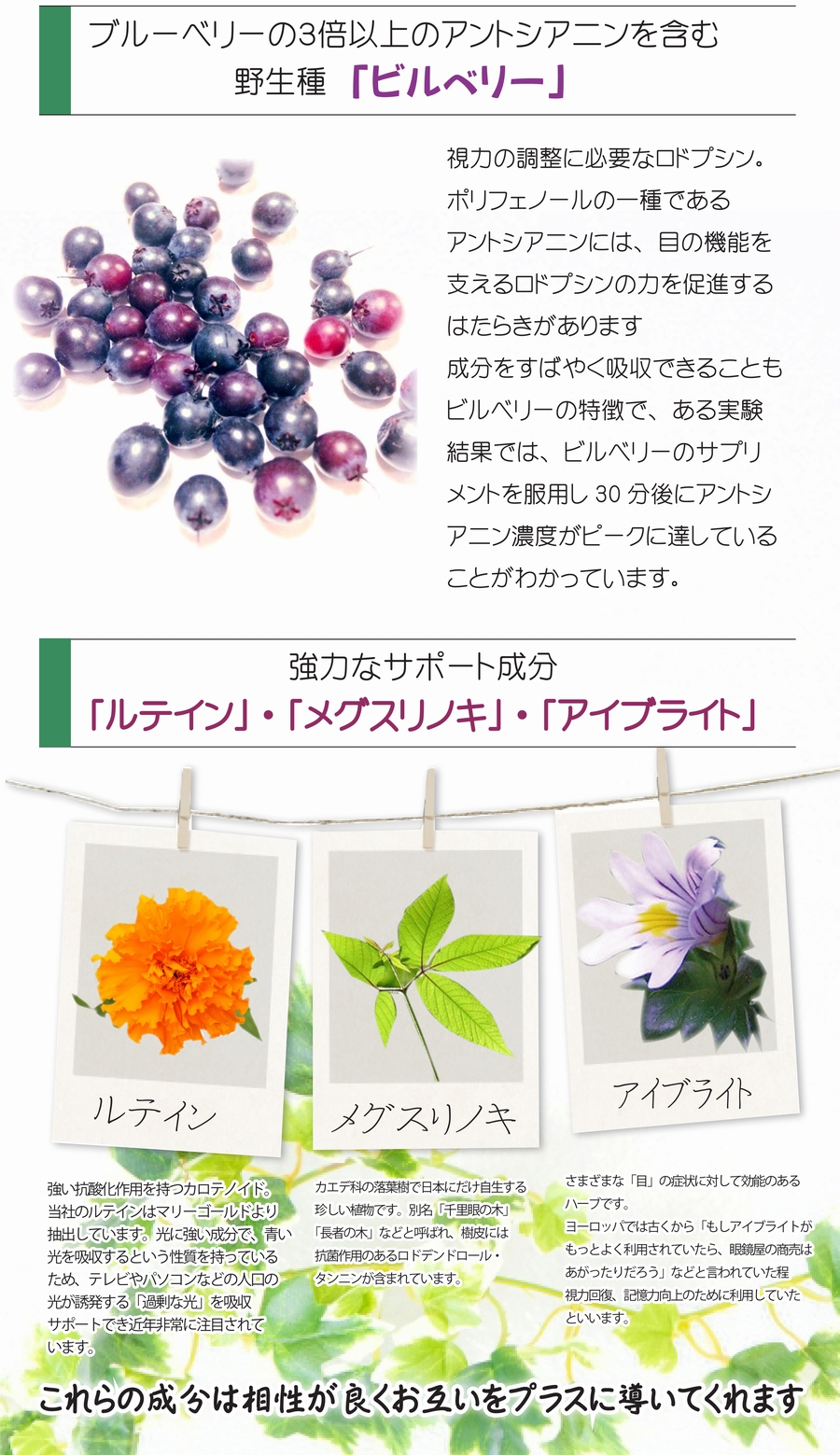 | 原材料名 | ブドウ糖、ブルーベリー果汁末、ルテイン含有マリーゴールド抽出物、 ビルベリーエキス、メグスリの木、カシスエキス、アイブライトエキス末、 ブドウ種子エキス、クエン酸、ステアリン酸カルシウム、β-カロテン |