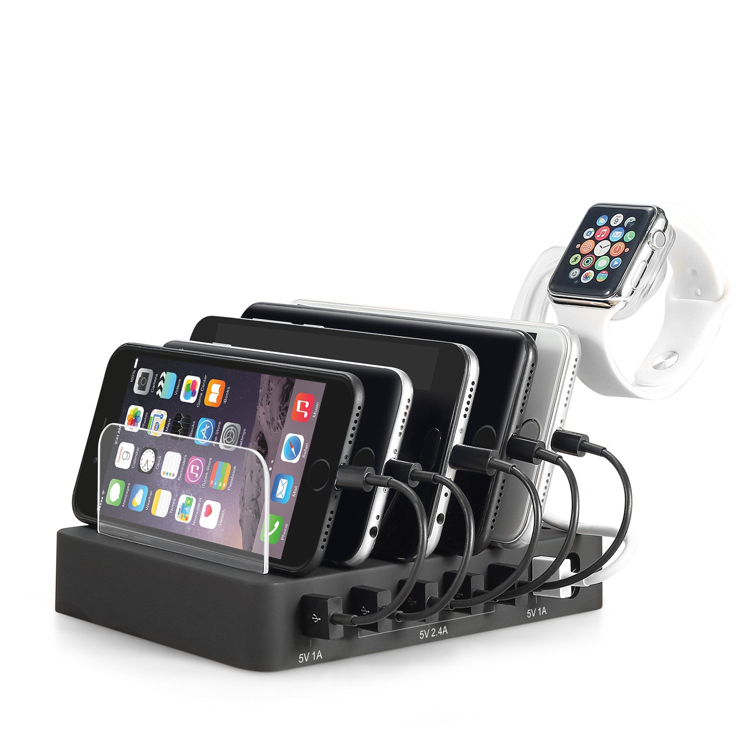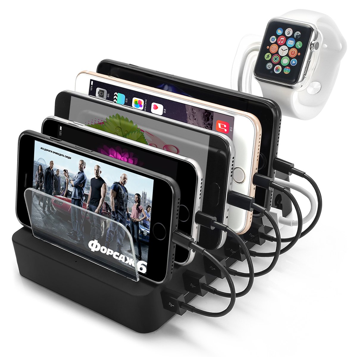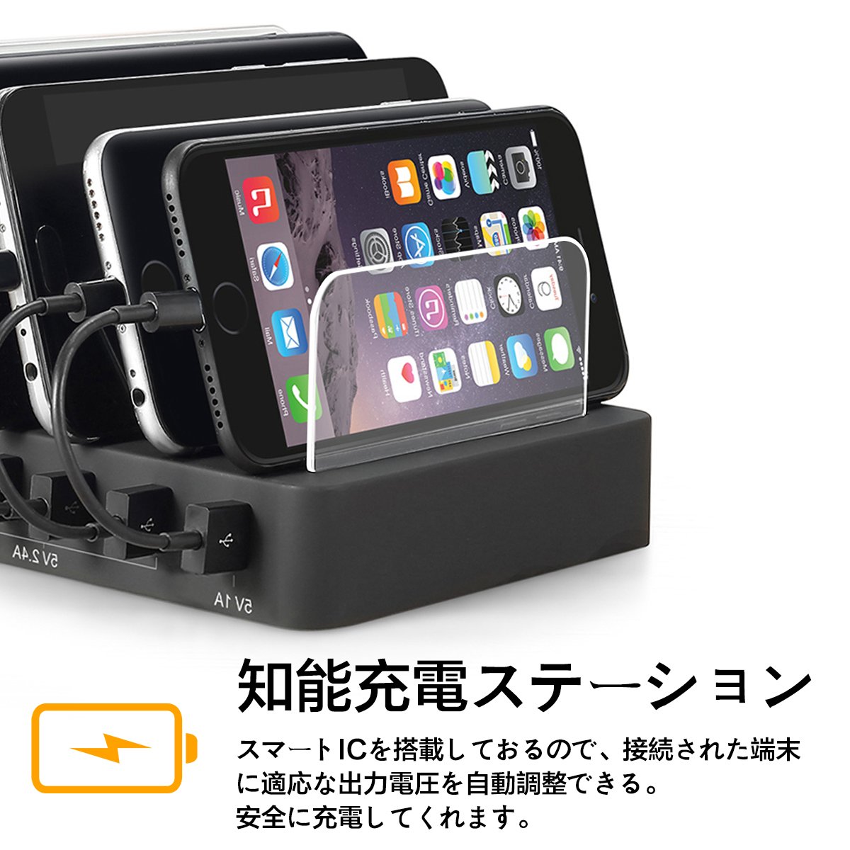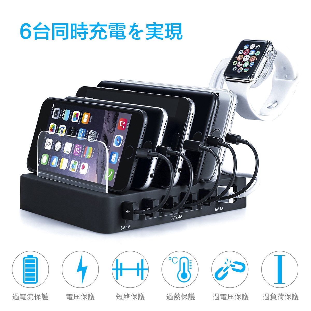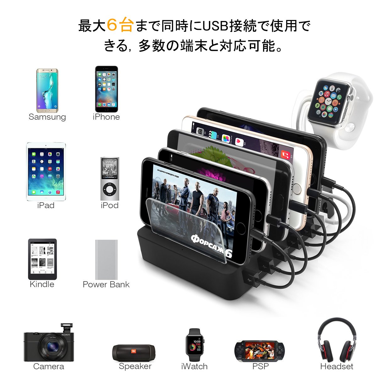 With six charging port designs, up to 6 units can be used simultaneously with USB connection, so even if there is not enough outlet, this one can be recharged simultaneously for Android & iPhone & iPad and many models.
