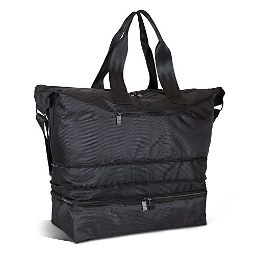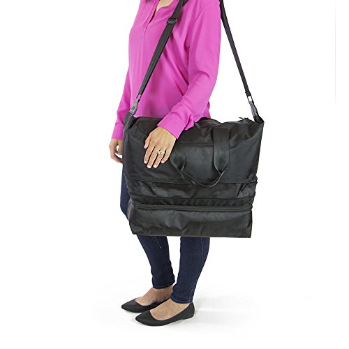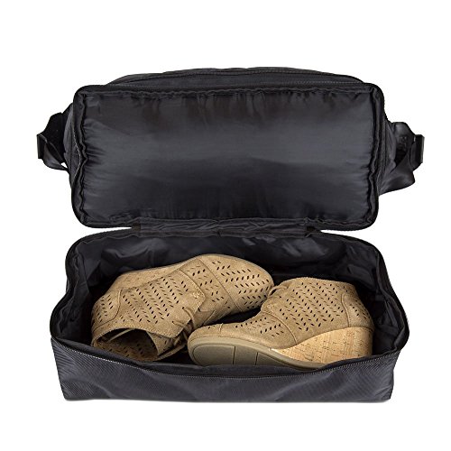 Product Description Meet your new travel buddy: the R-Label Weekender. This amazing travel bag makes packing for the weekend or a business trip easy as 1, 2, 3. One, fill the main compartment with clothes, cosmetics, or other travel essentials. Two, slip your shoes neatly into the shoe compartment so they do not damage any of your clothes. Three, adjust the shoulder strap, grab the handles or simply slide the pass through sleeve over your luggage handles. Just like you're all set to go! See, as easy at 1, 2, 3! The R-Label Weekender also expands, giving you an extra 2.5" of space for when you go a little crazy in the gift store. Weekend trips will now be more enjoyable with the R-Label Escape Weekender! Features: Lifetime guarantee Pass-through sleeve for luggage handles Material: Ballistic polyester Adjustable strap Non-slip shoulder strap pad Expandable zipper (adds 2.5" of extra space) Exterior Pocket: 8" long Interior Pocket: 17" long 0