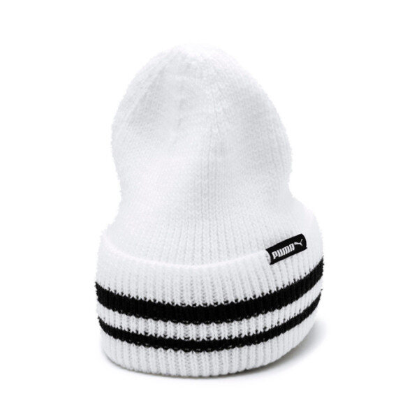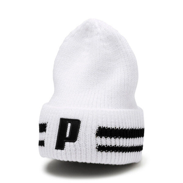 오버 사이즈 핏의 플레인 니트 비니.푸마 캣 로고가 메탈 소재로 전면에 부착되어 있음.