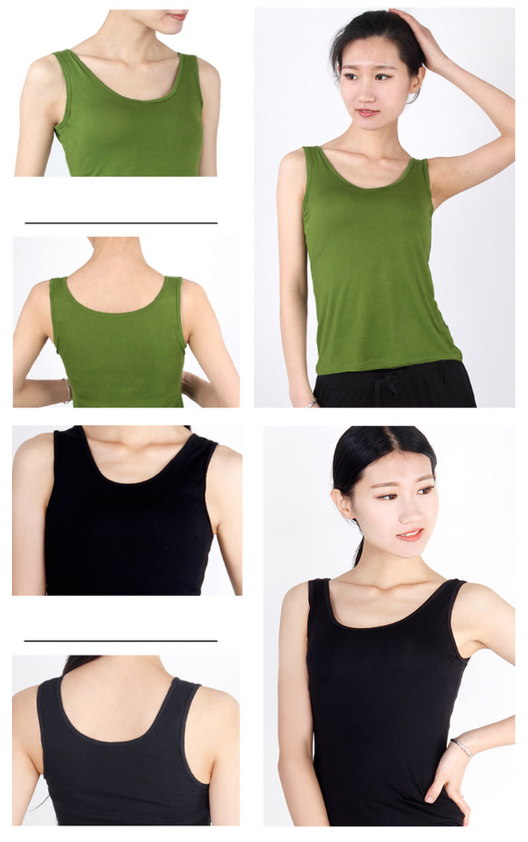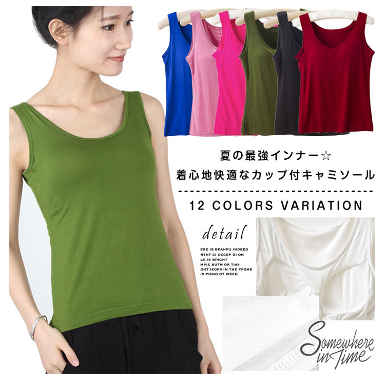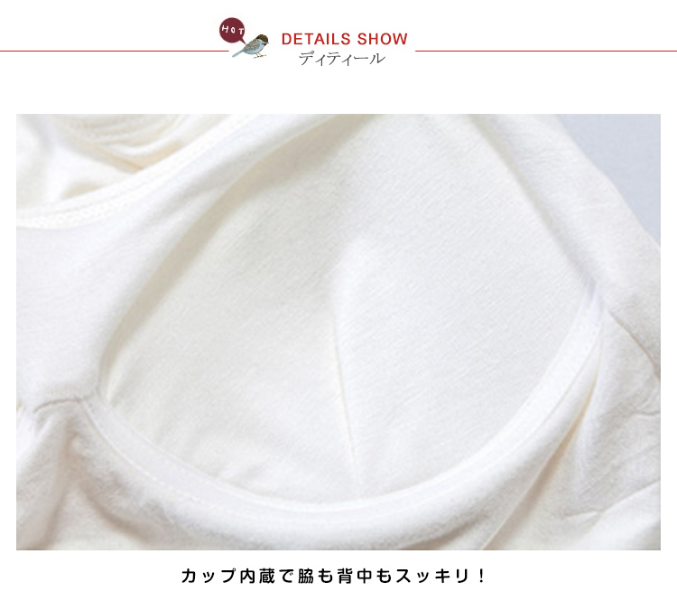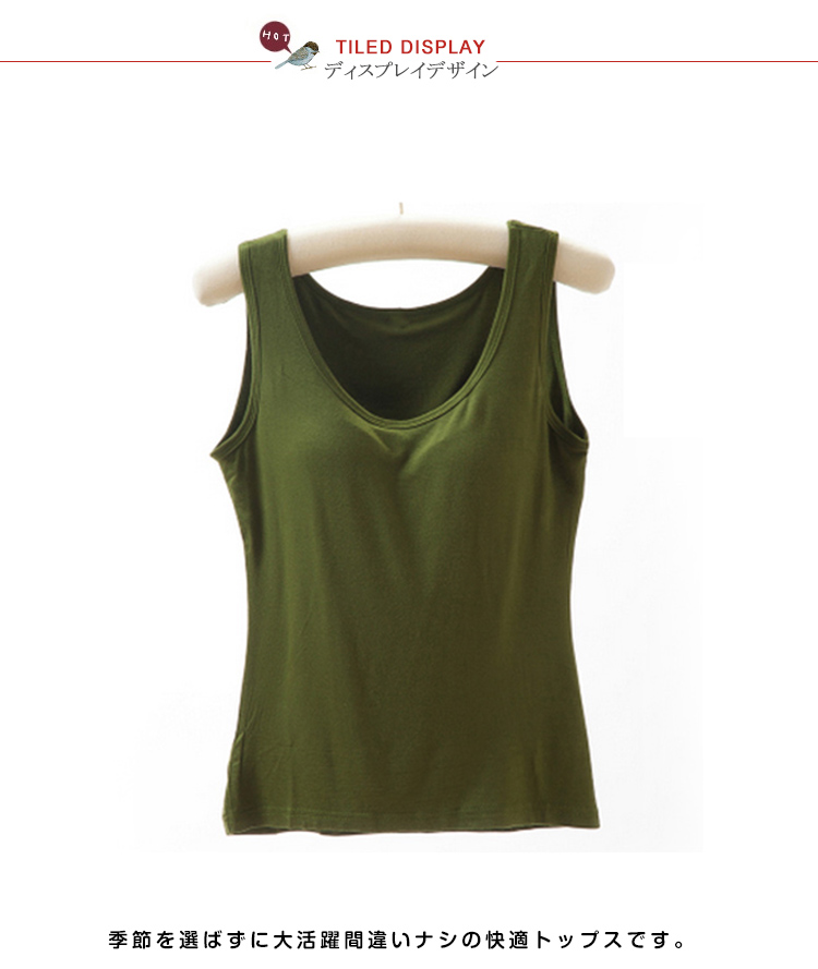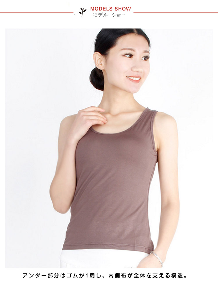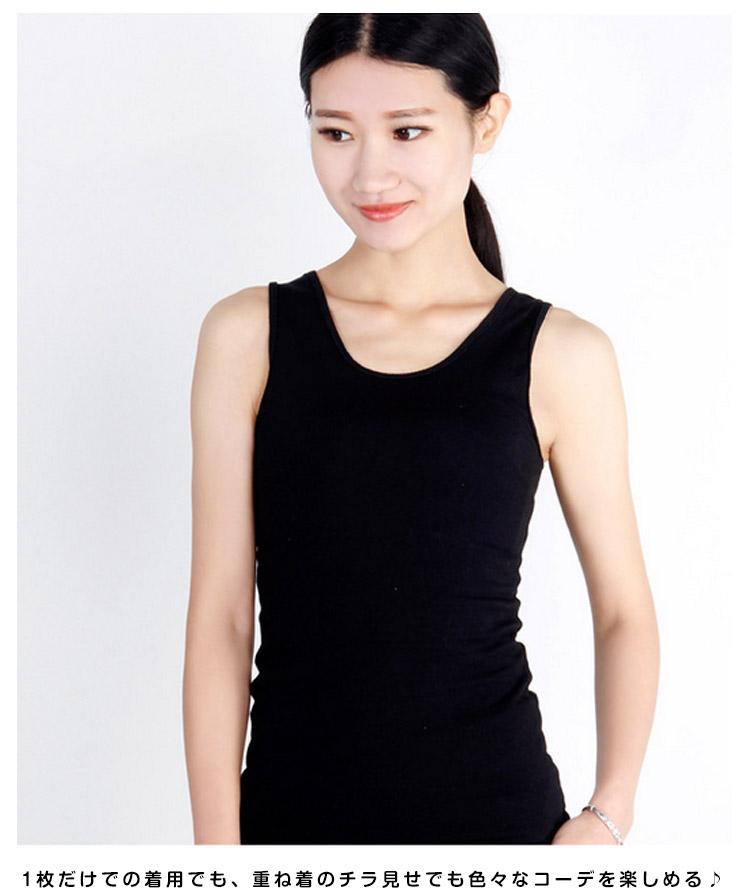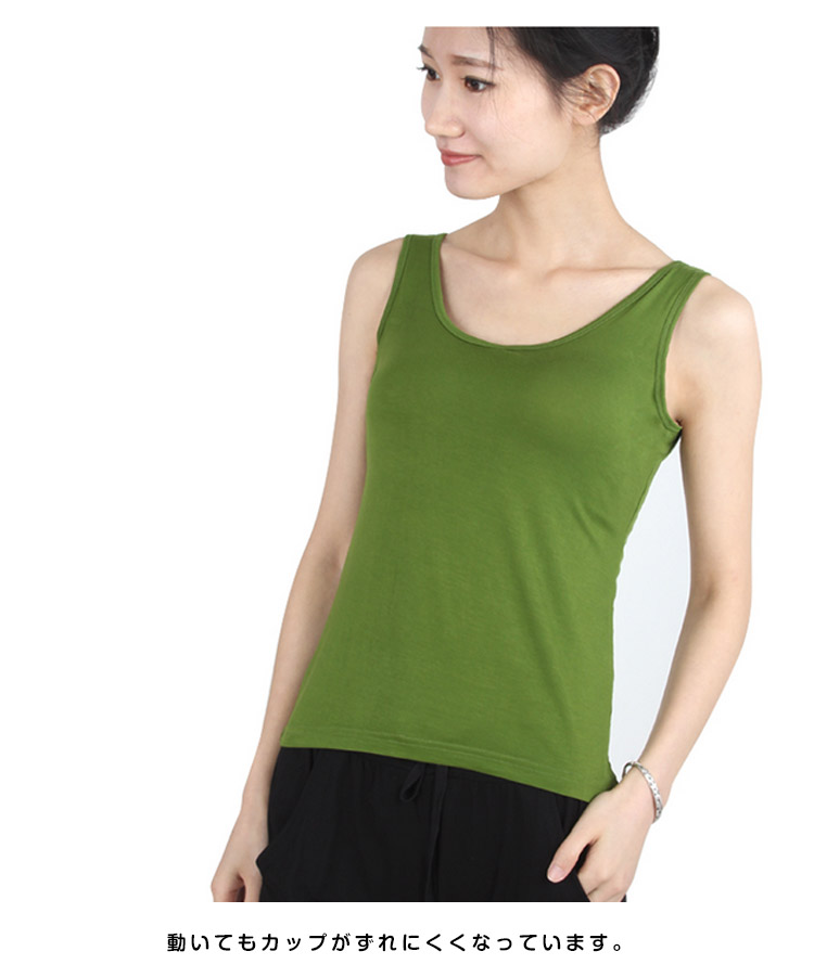 | きれいな丸胸が作れる、しっかりした素材のカップ付タンクトップ。アンダー部分はゴムが1周し、内側布が全体を支える構造。動いてもカップがずれにくくなっています。1枚だけでの着用でも、重ね着のチラ見せでも色々なコーデを楽しめる♪季節を選ばずに大活躍間違いナシの快適トップスです。ルームウェア、ヨガなどにも最適! | |
