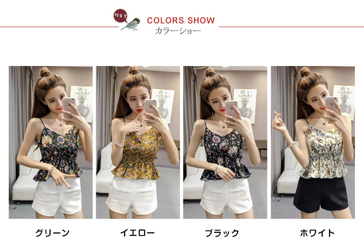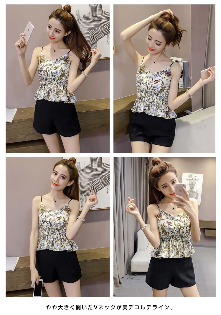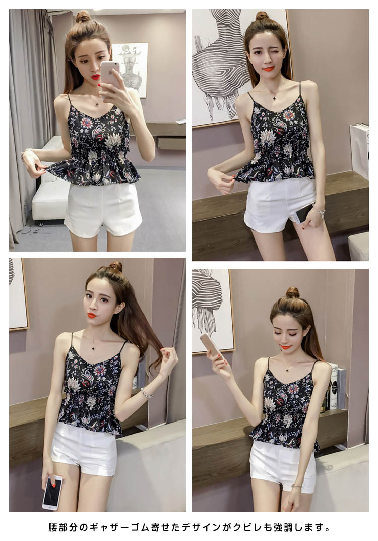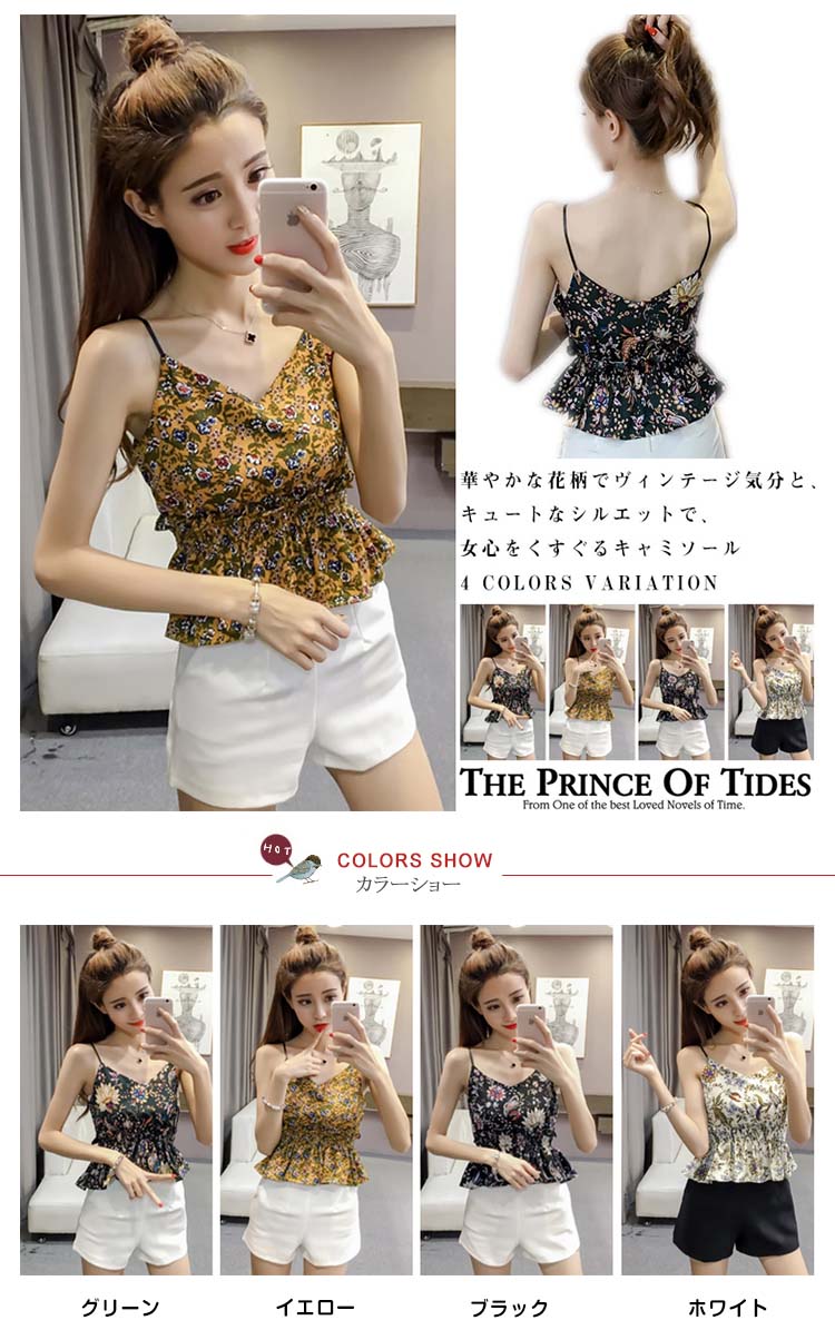 | 華やかな花柄でヴィンテージ気分と、キュートなシルエットで、女心をくすぐるキャミソール。柔らかくて薄手の風合いでさらりとした素材感が今季らしい。やや大きく開いたVネックが美デコルテライン。腰部分のギャザーゴム寄せたデザインがクビレも強調します。落ち着いたカラバリで大人っぽく今季にイチオシトップス。 | |
