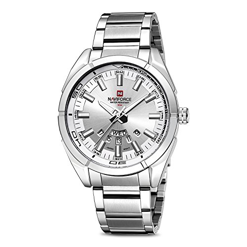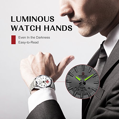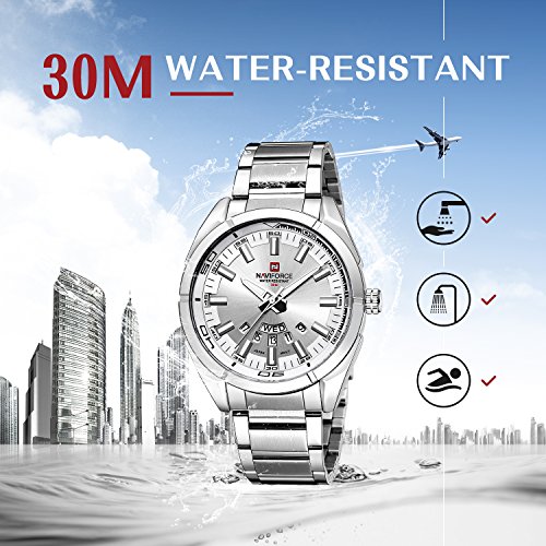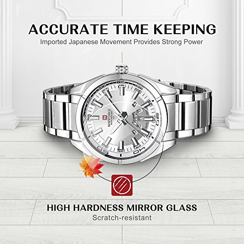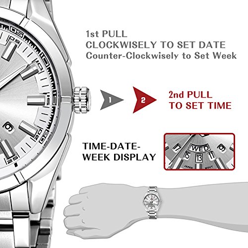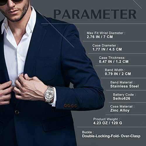 Highlights: • Imported Japanese quartz movement provides precise and accurate time keeping. Pull the crown for 2 times to set time, date and week. • 30M Water-resistant, hand-wash, swimming, shower, no problem! Put on it and join in outdoor activities or pool party! • Double Locking Fold Over Clasp. Stainless steel watch band. • Made of high qulity zinc alloy, sturdy and not easy to fade. • White coating on the watch hands helps to see time clearly in the darkness. • Classic Business Casual Dress Watch Design. Combines quality, leading edge fashion, and value. Material: • Case Material: Zinc Alloy • Case Back Cover: Stainless Steel • Band Material: Stainless Steel • Watch Face: High Transparent Mineral Glass Specification: • Band Length: 8.66 inch / 22 cm • Band Width: 0.79 in / 2 cm • Case Thickness: 0.47 in / 1.2 cm • Case Diameter: 1.77 in / 4.5 cm • Max Fit Wrist Diameter: 2.76 in / 7 cm • Band Clasp Type: Double Locking Fold Over Clasp • Product Weight: 4.23 OZ / 120 G • Battery Code: JAPAN626 What Is In The Package: • Men's analog quartz watch x 1 **NOTE**: • Please Take Off the Protection Film Cover On the Watch Face Before Use for Better Experiences. • Please DONOT Press Any Buttons Underwater. Also avoid the use in extreme hot or cold temperature. • If mist or droplets found inside watch surface, please reach us immediately for maintenance to prevent moisture corrosion of the internal components. • Clean the strap by a soft cloth on regular bases is highly recommended. • Too much water contact will shorten watch life.Feature
